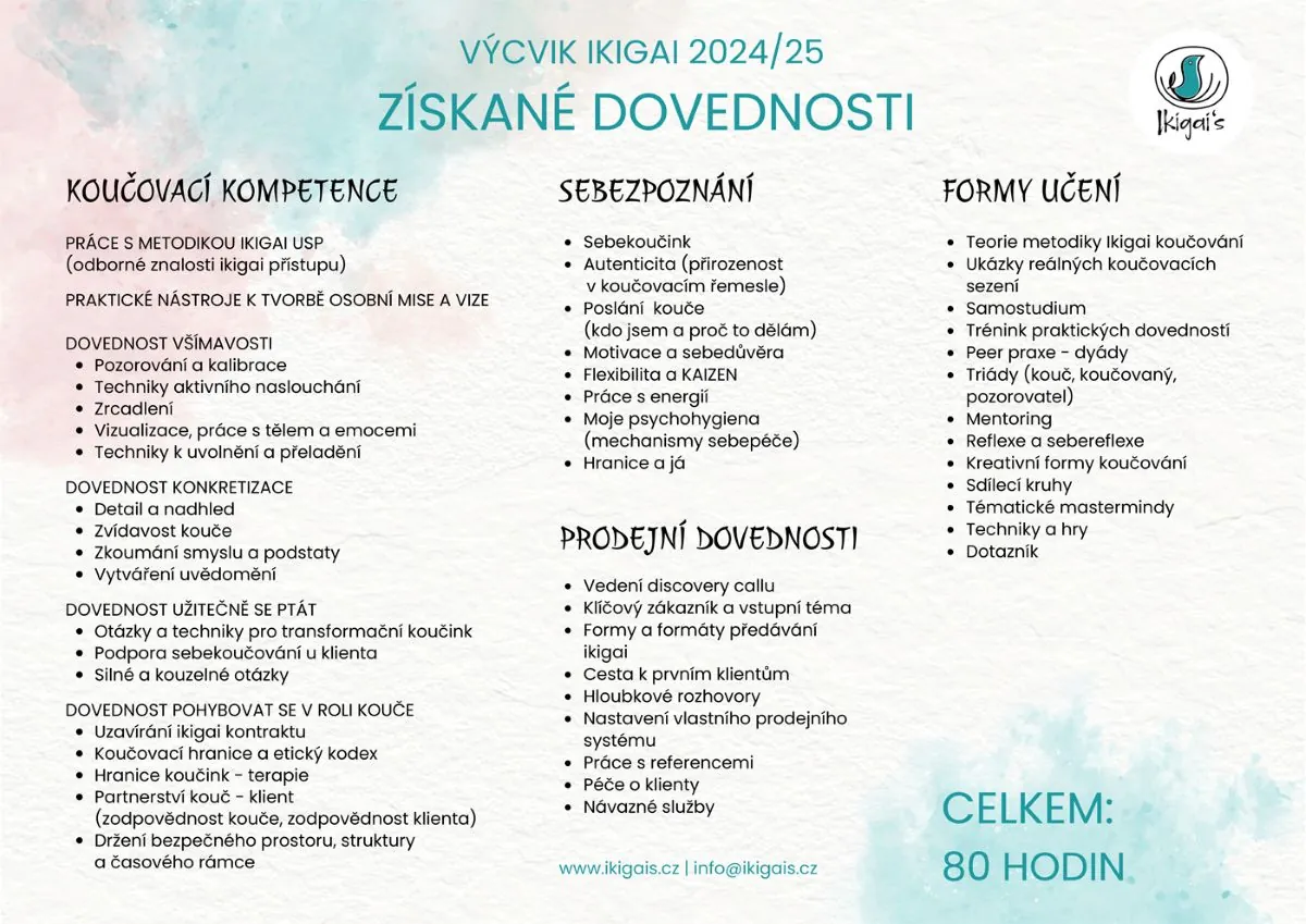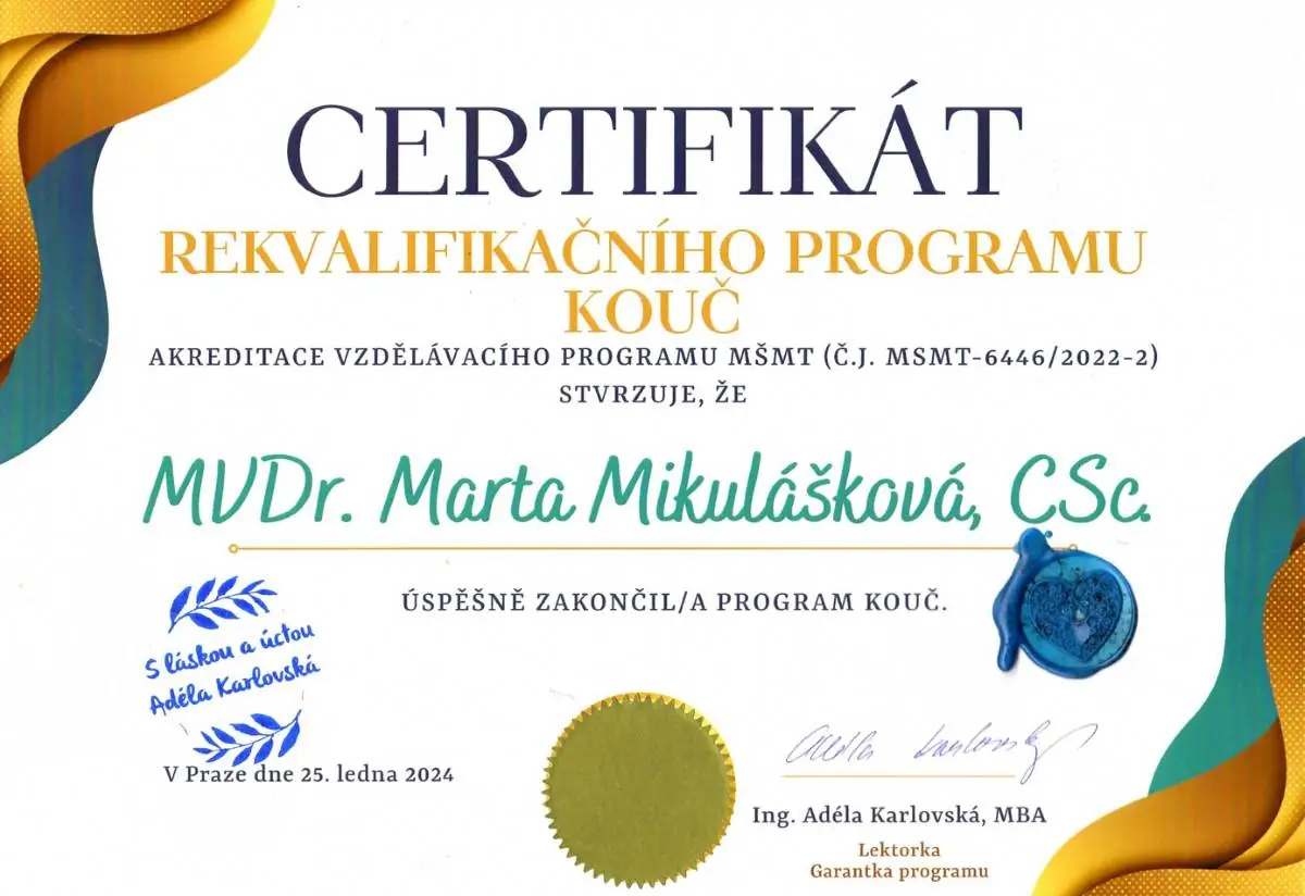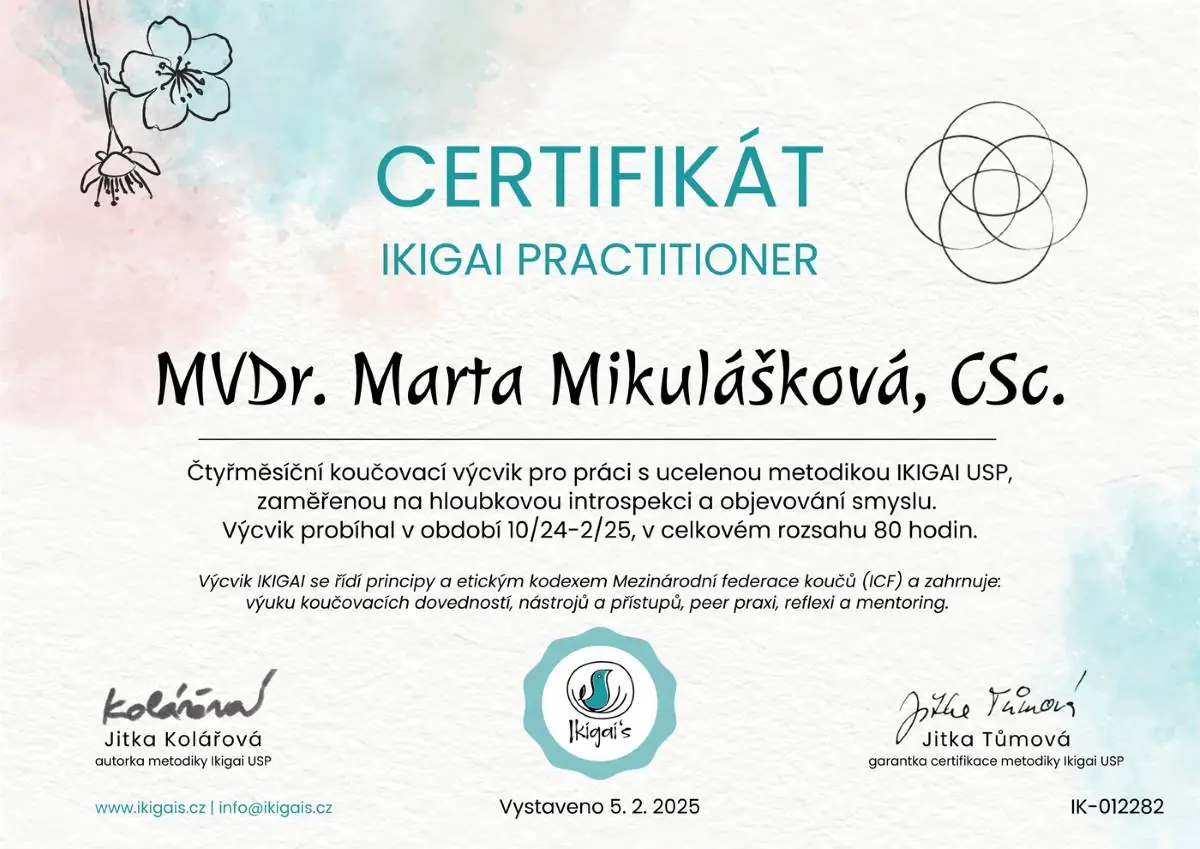 V roce 2024 jsem tedy absolvovala rekvalifikační kurz pod akreditací MŠMT (Č.J. MSMT-6446/2022-2) s certifikátem rekvalifikačního programu KOUČ a v roce 2025 získala certifikát Ikigai kouče pod č. IK-012282.