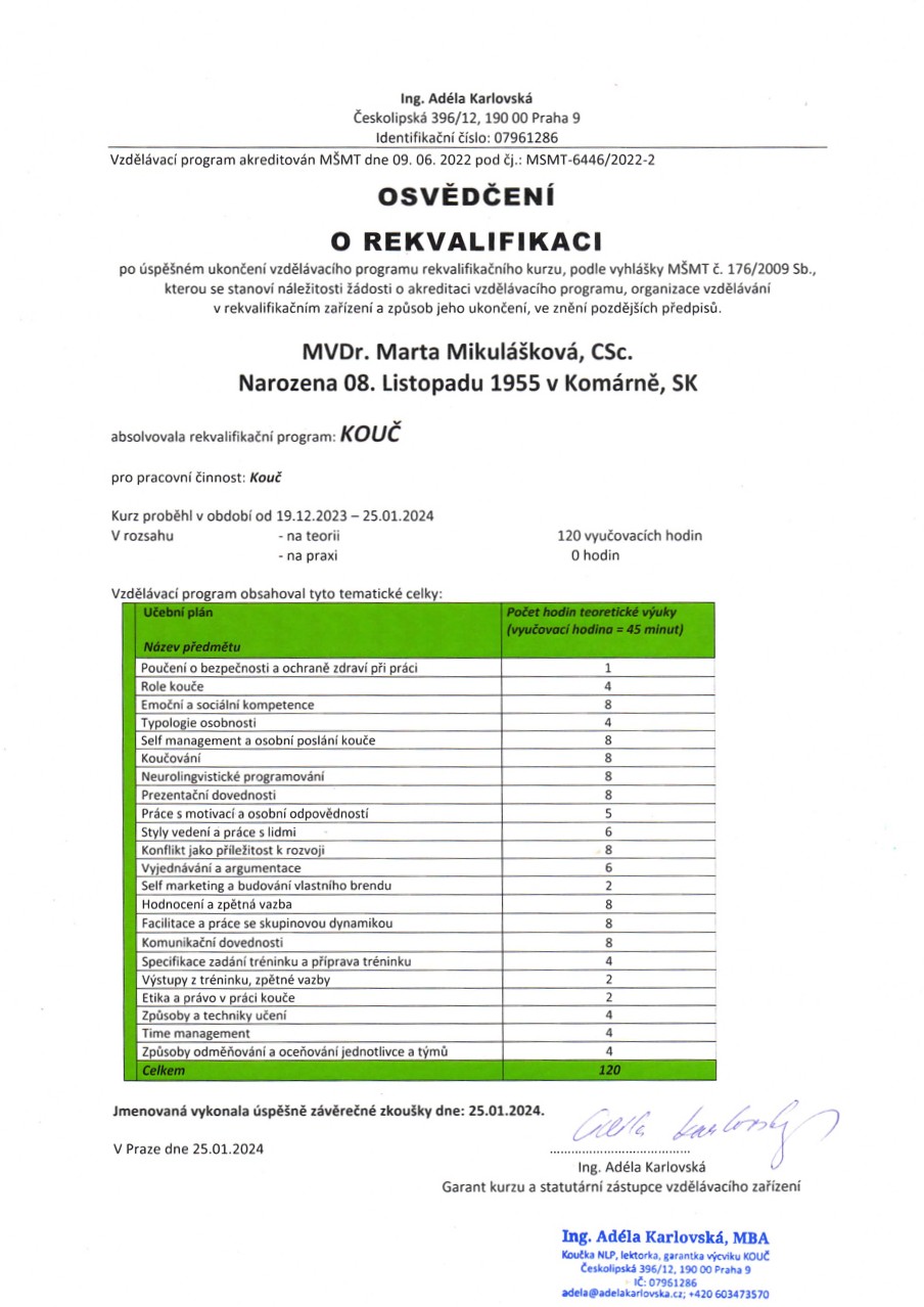 V roce 2024 jsem tedy absolvovala rekvalifikační kurz pod akreditací MŠMT (Č.J. MSMT-6446/2022-2) s certifikátem rekvalifikačního programu KOUČ a v roce 2025 získala certifikát Ikigai kouče pod č. IK-012282.